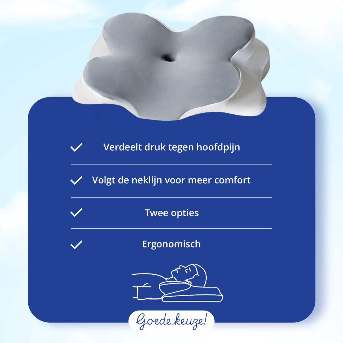 Het hoofdkussen is ontworpen met comfort en ondersteuning in gedachten. Dankzij het ergonomische design en de hoogwaardige memory foam vulling vormt het kussen zich naar de contouren van je hoofd en nek. Het is geschikt voor zowel zij- als rugslapers en biedt twee verschillende zijden, elk met een eigen functie.